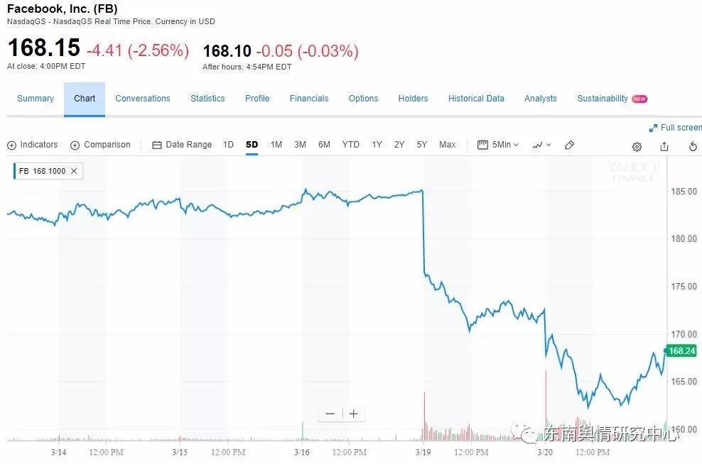 受上周末Facebook泄密門影響,本周一美股開盤深跌。道指盤中跌476點,抹去年內(nèi)全部漲幅,最終收跌335點。標(biāo)普500最深跌2%,與道指一起經(jīng)歷了2月8日跌入技術(shù)性盤整區(qū)間以來的最大跌幅。納指收跌1.8%,為六周以來最大單日跌幅。